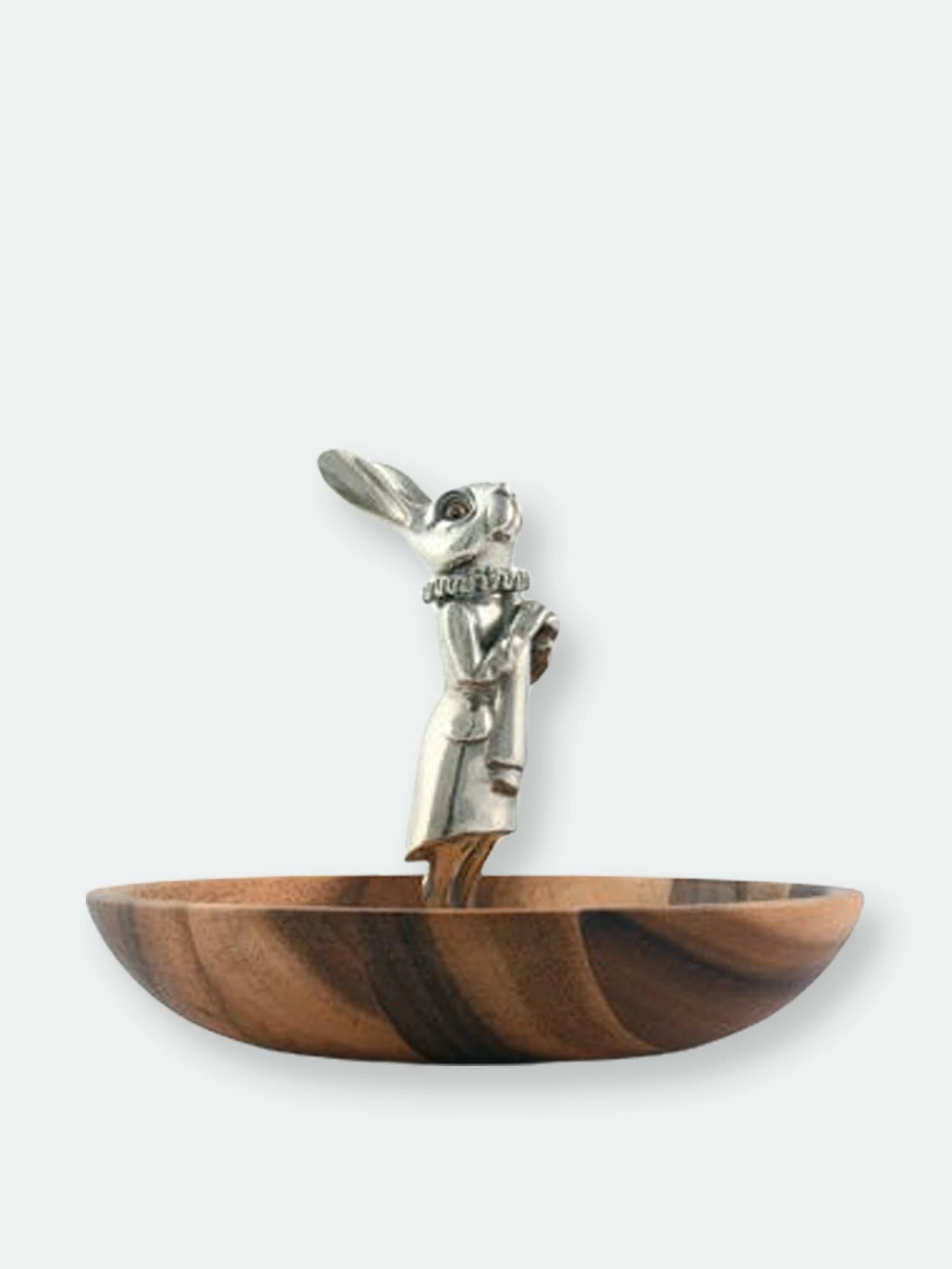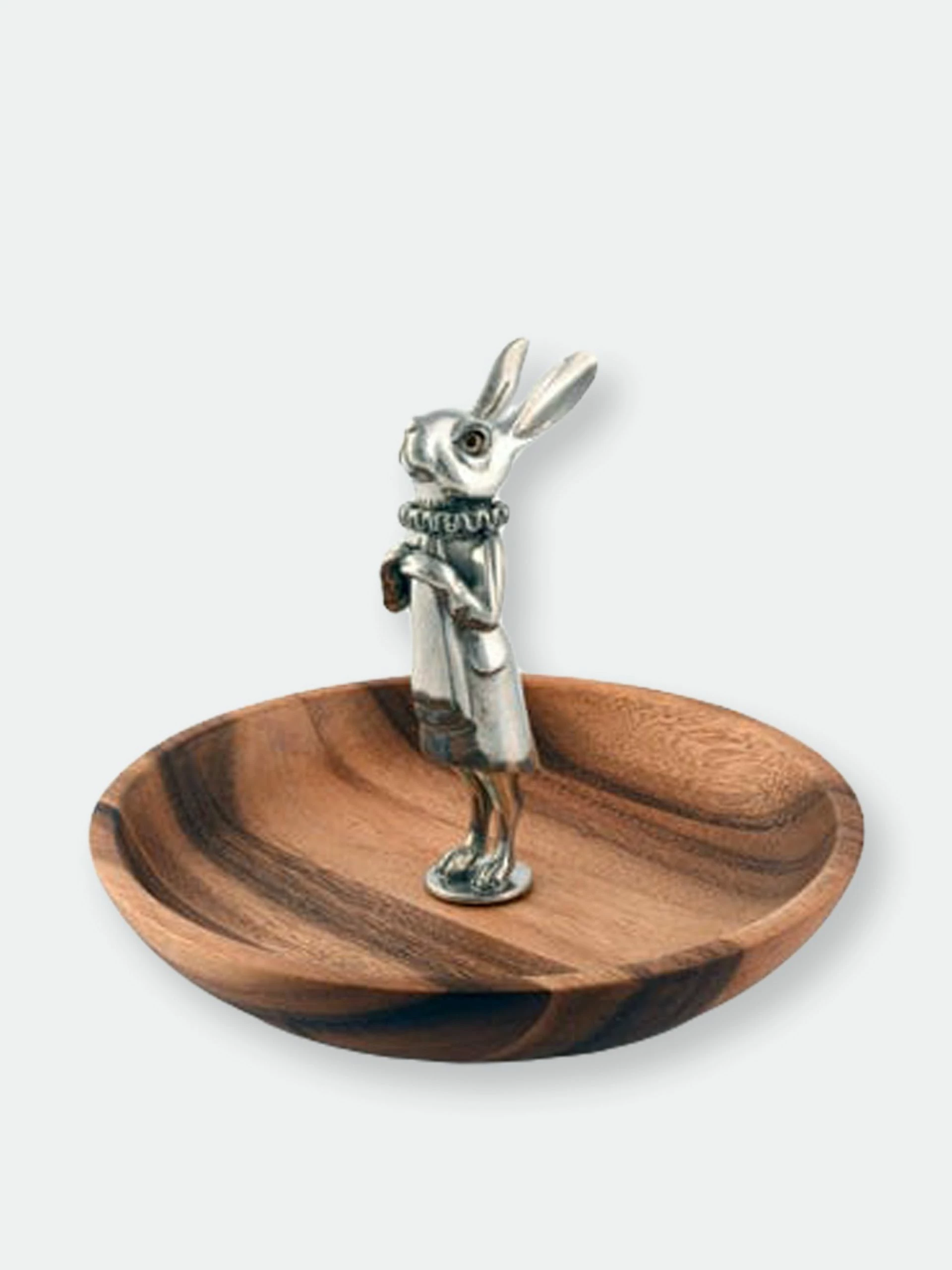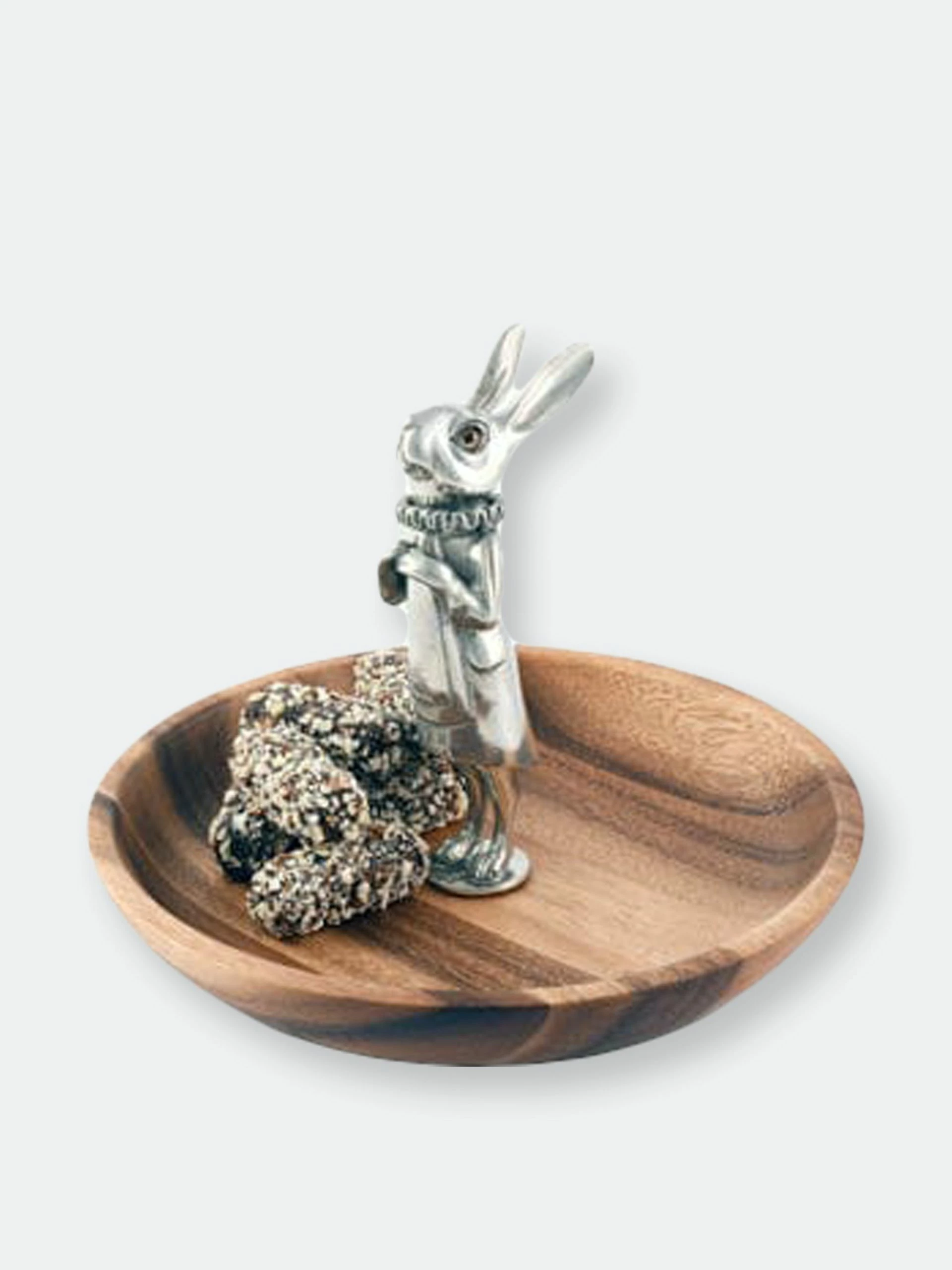 Set a whimsical note for springtime gatherings with friends and family with this charming bunny tidbit bowl. The rich and warm tones of acacia hardwood are beautifully complemented by the lustrous sheen of our artisan-handcrafted pure pewter rabbit.Put this heirloom-worthy statement piece on your coffee table filled with mixed nuts, pastel mints or fine chocolates. Durably designed for years of use, this conversation-starting tidbit bowl is sure to get all your social events off on the right paw.