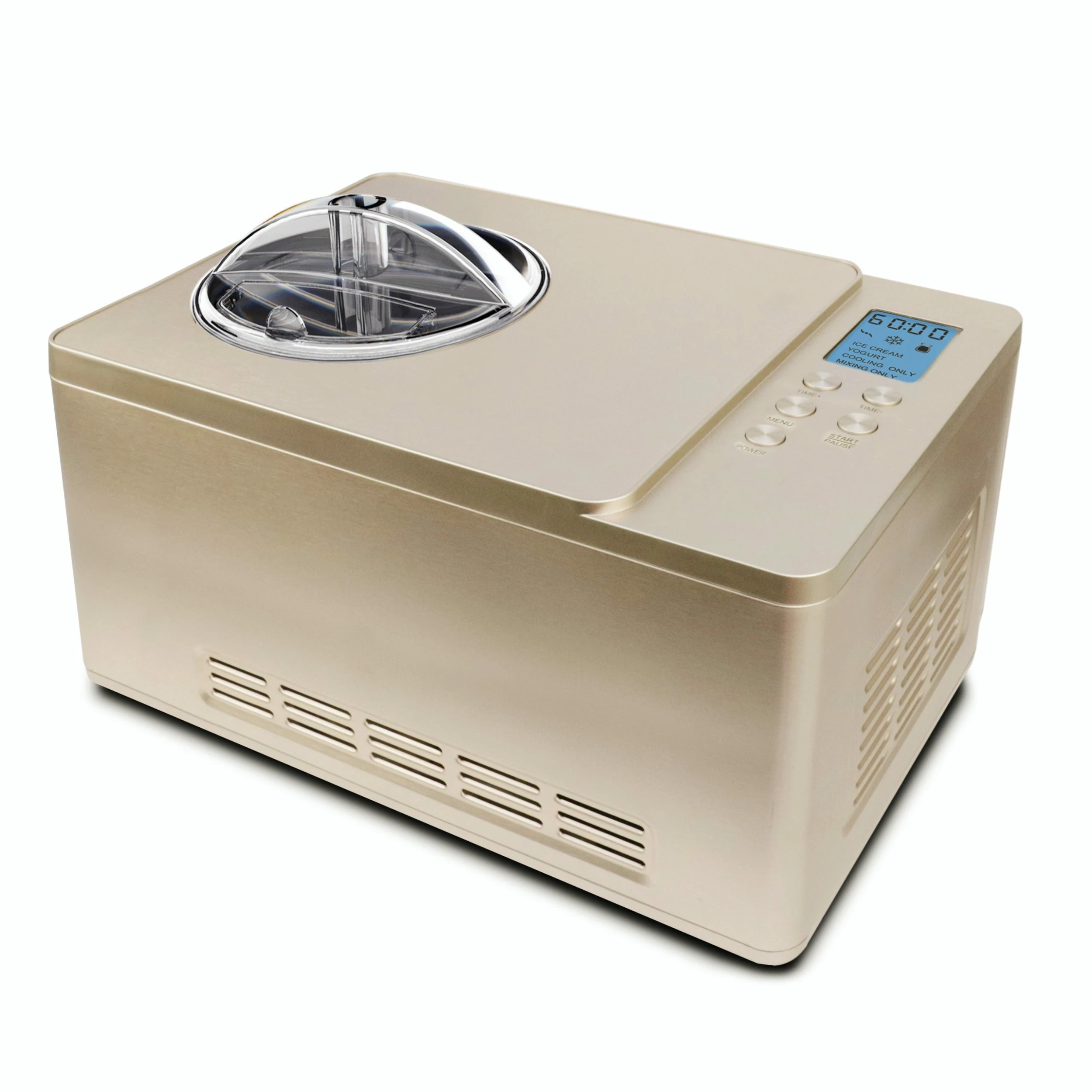 Make delicious homemade ice cream and yogurt that you can fully customize to taste with the Whynter ICM-220CGY 2 Quart Ice Cream & Yogurt Maker. Incredibly easy to use, you can create delicious ice cream, rich creamy gelato, and sorbet as well as fresh and healthy all-natural yogurt – from traditional to Greek styles, using ingredients you trust all in the comfort of your own home. Ideal for entertaining, this high capacity machine makes up to two quarts of your favorite frozen dessert or yogurt style in a single batch.The ice cream function offers premium functions and features not available in budget machines. The powerful built-in compressor freezer allows for continuous use without the inconvenience of having to pre-freeze the stainless steel mixing bowl. The Whynter ICM-220CGY features an Extended Cooling function that prevents the ice cream mixture from melting and a Motor Protection function that stops the motor from churning to prevent overheating or damage to the motor when the mixture becomes solid.The yogurt function incubates your choice of milk and yogurt starter at temperatures between 104ºF to 110ºF. Making homemade yogurt allows you to make your favorite style using your preferred ingredients such as Probiotics, organic, raw or non-dairy milks. Ideal for people with food allergies or those who want a natural alternative to store bought yogurt. Add in fruit, nuts or other toppings to make yogurt parfaits, fruit yogurt or enjoy plain. Not only save money and be environmental friendly, homemade yogurt also tastes a whole lot better.The luxurious champagne gold stainless steel exterior and soft touch LCD control panel will accent any kitchen counter. This will quickly become your new best friend. You will never again have to wait hours or take up freezer space before being able to make your favorite frozen dessert or worry about the ingredients used. This unit includes an electronic timer, ice cream scoop, and we’ll even send you some secret recipes on request!